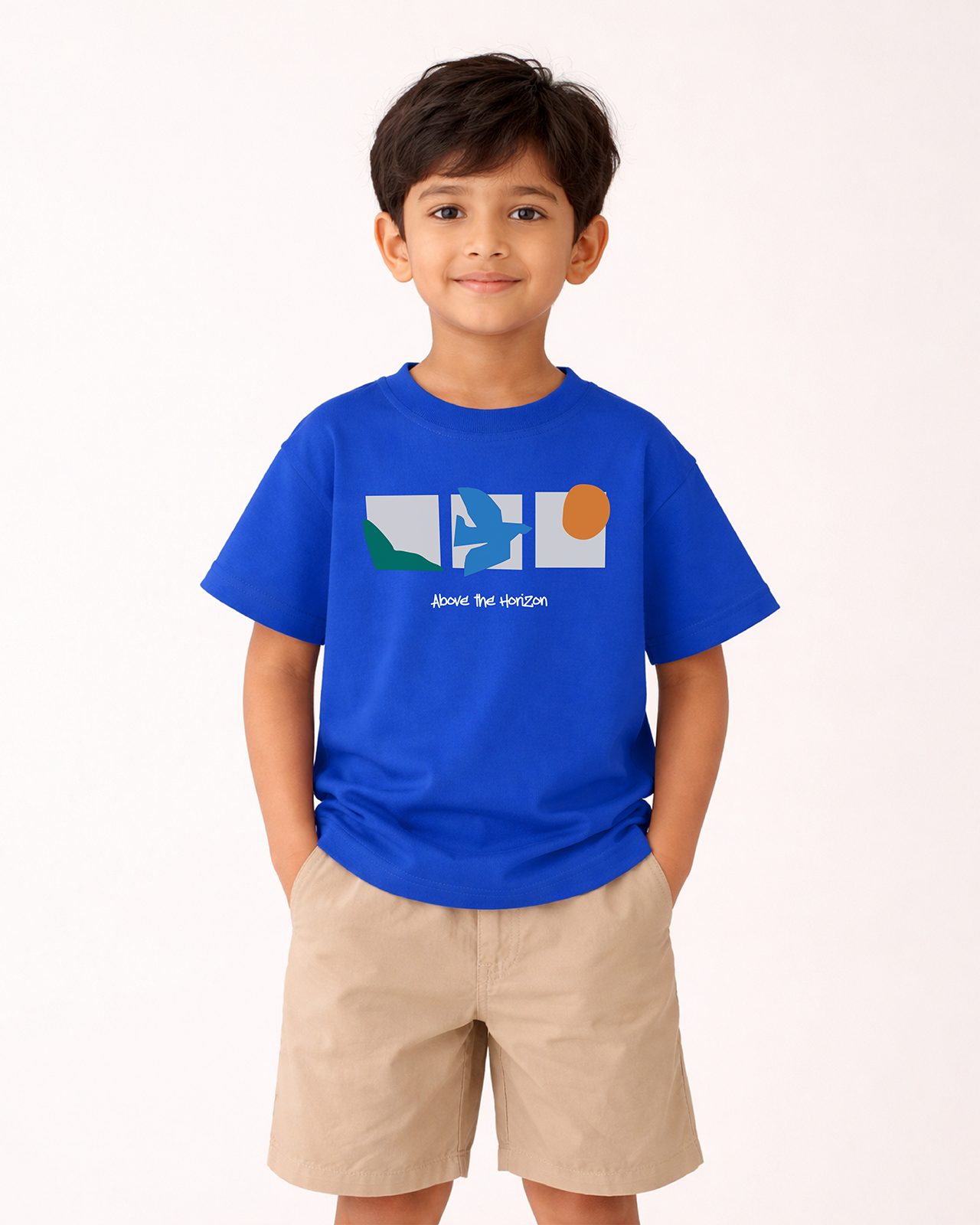 A fun and uplifting everyday tee designed for little explorers. The Above the Horizon t-shirt features a clean graphic with playful shapes and soft colors that inspire curiosity and imagination. Made in a vibrant royal blue shade.
