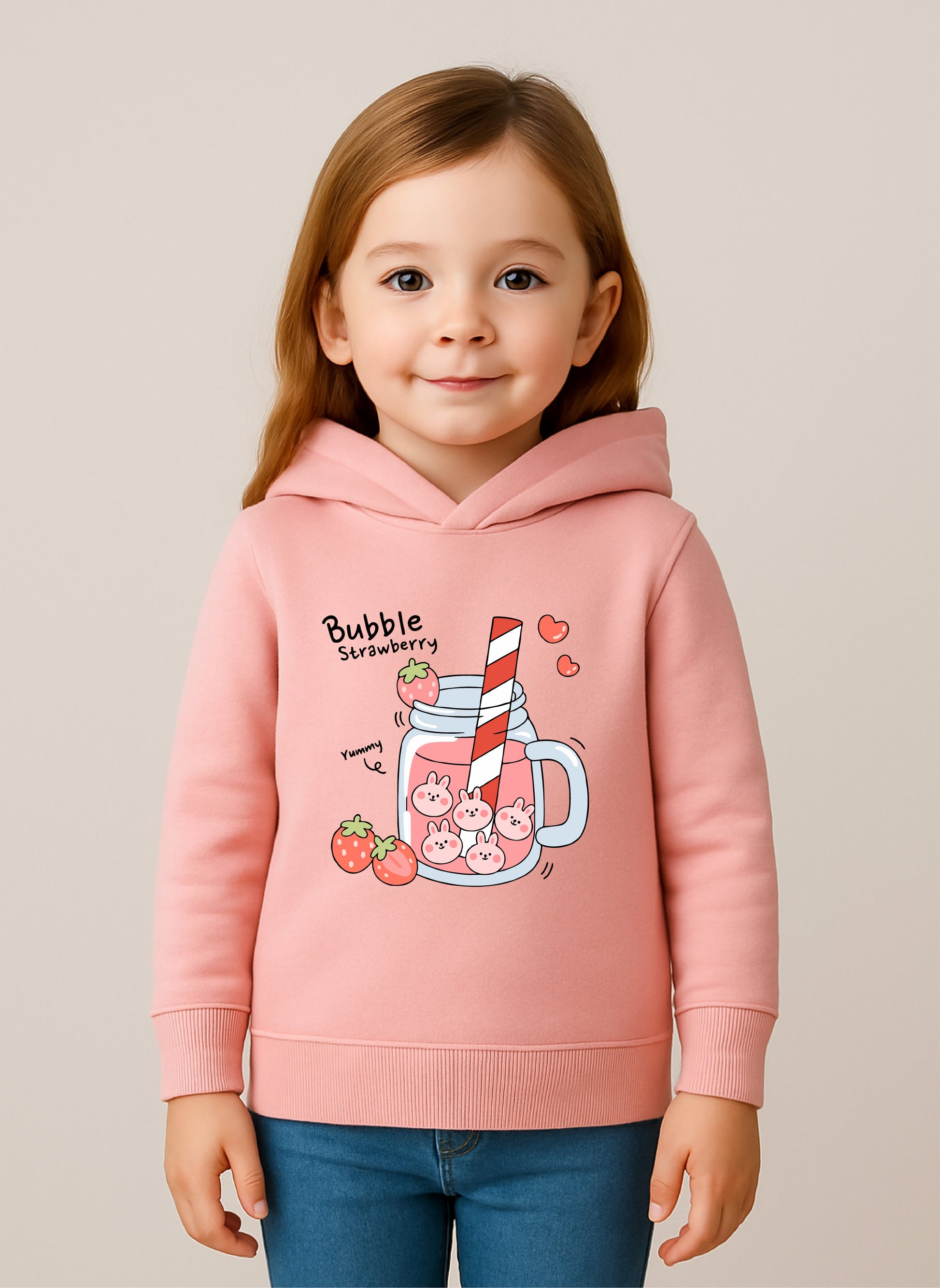 Cute, cozy, and absolutely irresistible our Bubble Strawberry hoodie is made for kids who love all things sweet and fun! Crafted from soft, premium fleece in a pastel pink shade, it features an adorable illustration of a bunny filled strawberry milk jar with charming doodles and playful text.