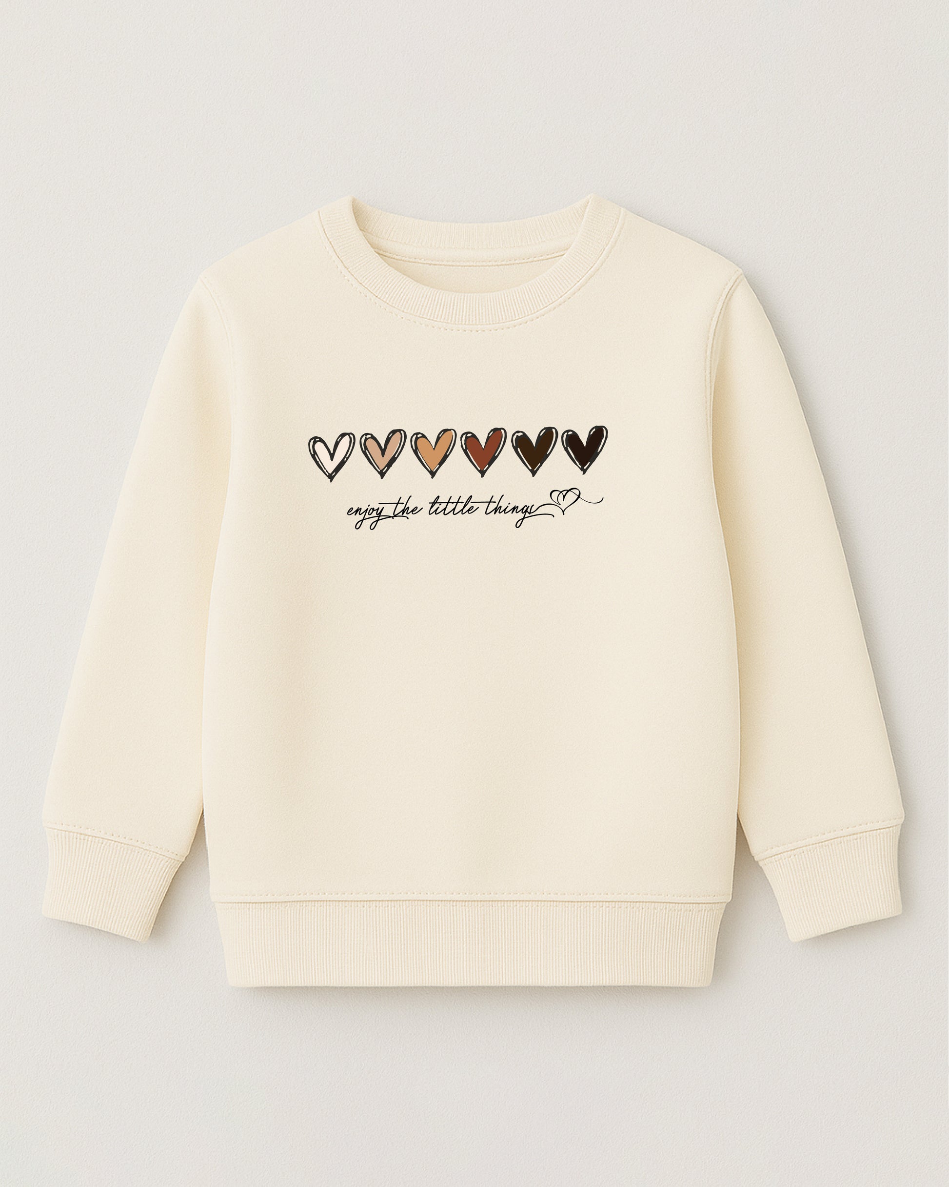 A cozy reminder to find joy in life’s simplest moments. This cream-toned sweatshirt features a minimal yet heartwarming design, a row of hand drawn hearts in varying earthy shades, paired with the uplifting quote “enjoy the little things.”