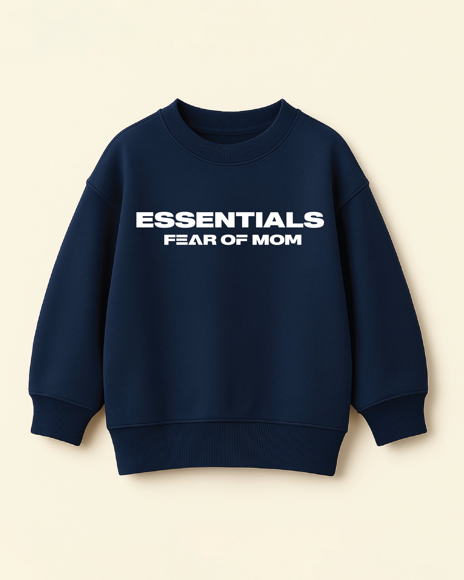 Keep it cool and comfy with this Navy Blue Kids Oversized Sweatshirt. Crafted from premium soft fleece, it features ribbed cuffs and hem for a snug fit while keeping the overall relaxed vibe. Designed with a bold “ESSENTIALS FEAR OF MOM” graphic on the chest, this playful twist makes it a fun and standout piece in your kid’s wardrobe.