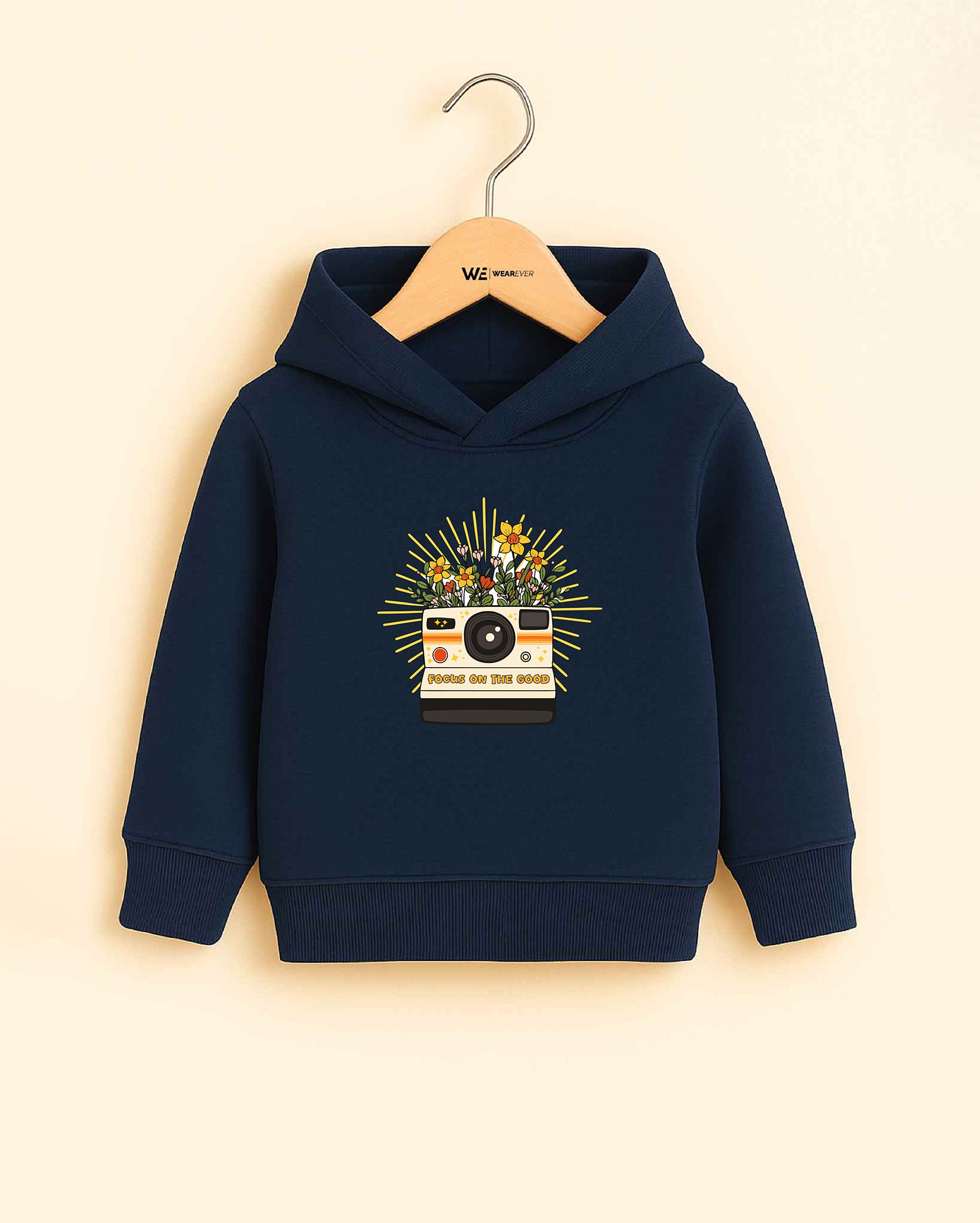 A cozy reminder to see the bright side this navy blue hoodie is all about good vibes and positivity! Featuring a vintage camera bursting with colorful flowers and the uplifting phrase “FOCUS ON THE GOOD”, it’s a cheerful wardrobe essential for little dreamers with big hearts.