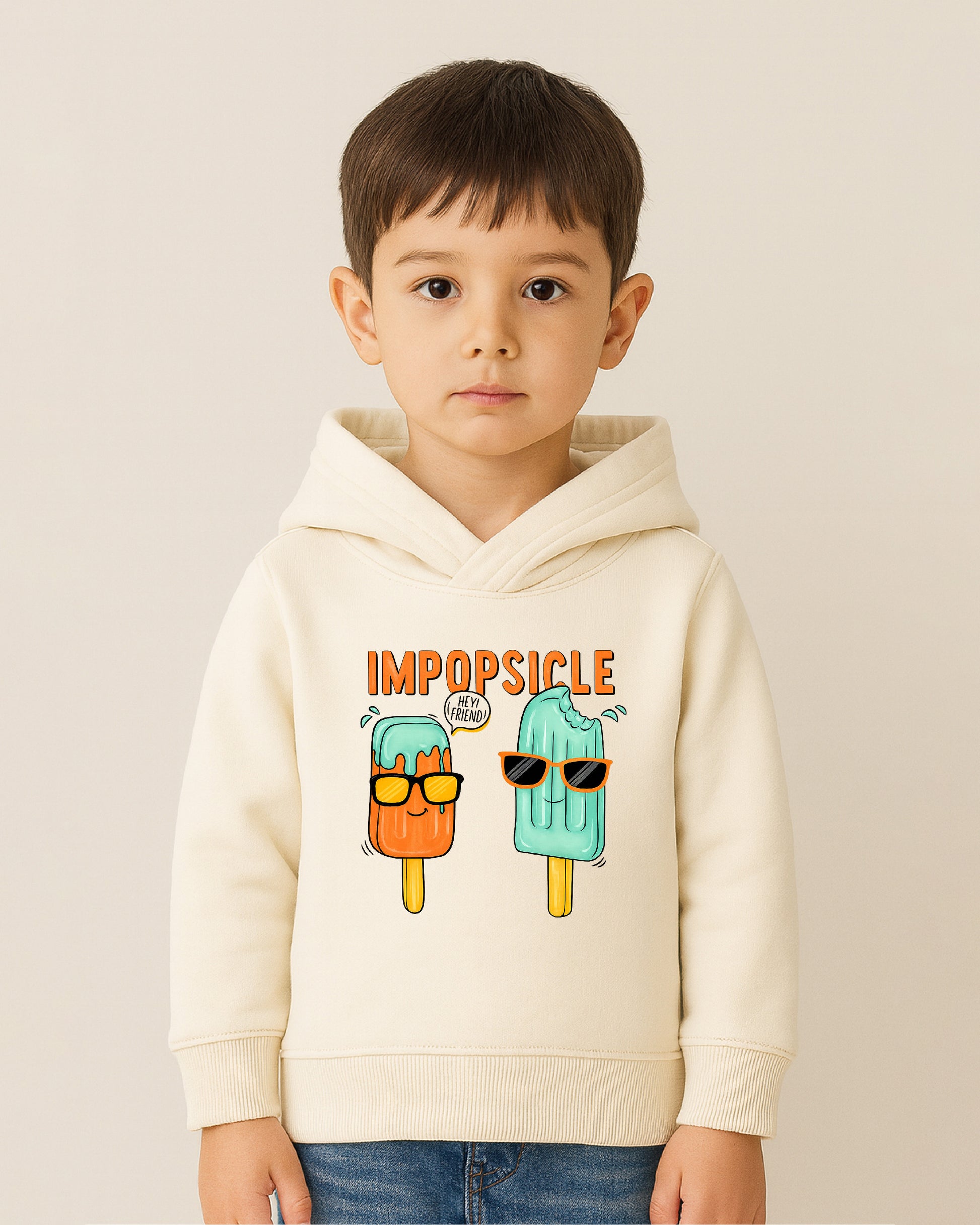 This cozy cream colored hoodie brings a playful twist to chilly days! Featuring two cheerful popsicles wearing sunglasses and the witty slogan “IMPOPSICLE – Hey Friend!”, it’s designed to keep your little one comfy and cool at the same time.