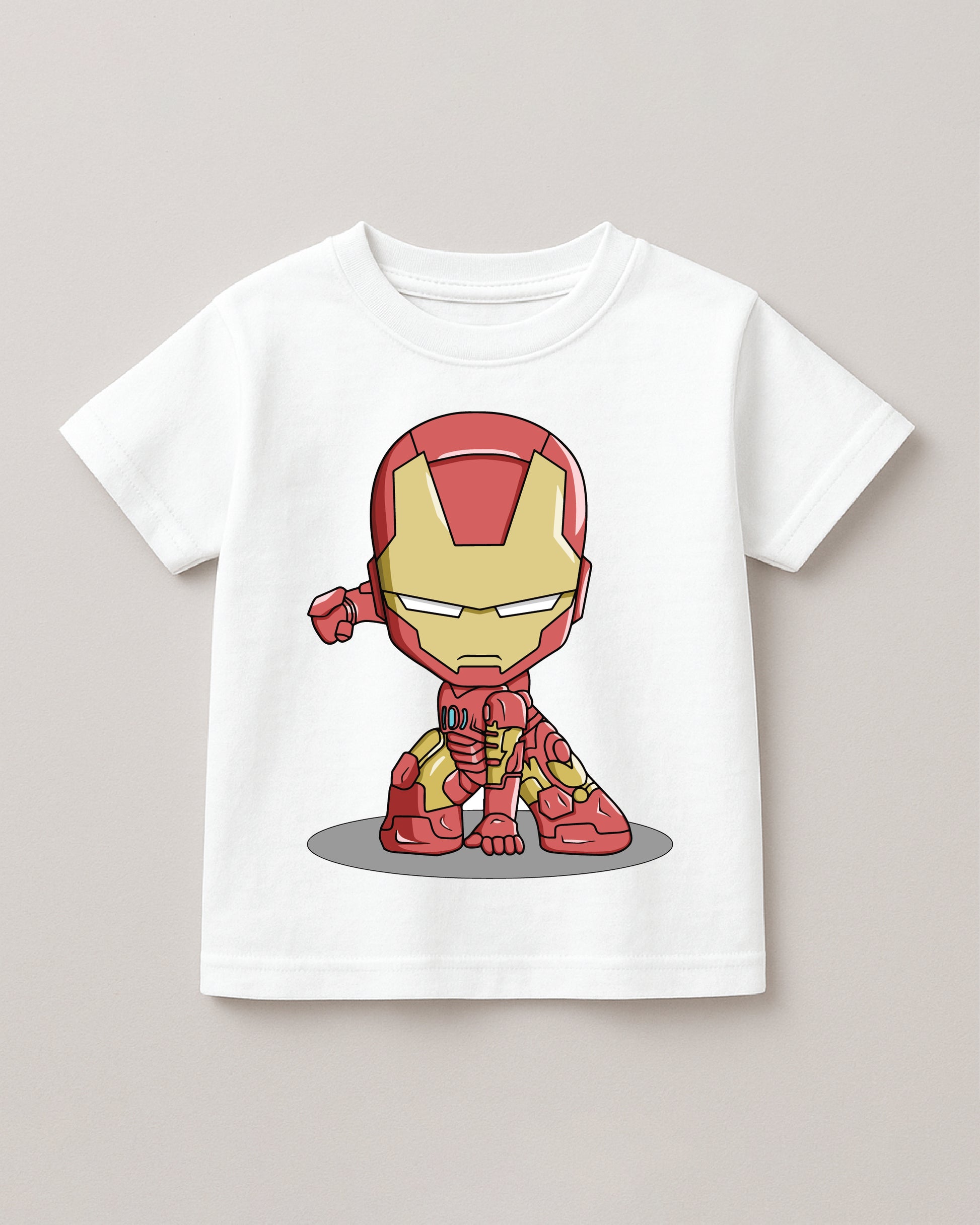 Let your little hero suit up in style with this Iron Man graphic tee. Featuring a cute cartoon style Iron Man print in his iconic red and gold armor, this white t-shirt is perfect for Marvel fans. Crafted from soft, breathable cotton blend, it ensures all-day comfort.