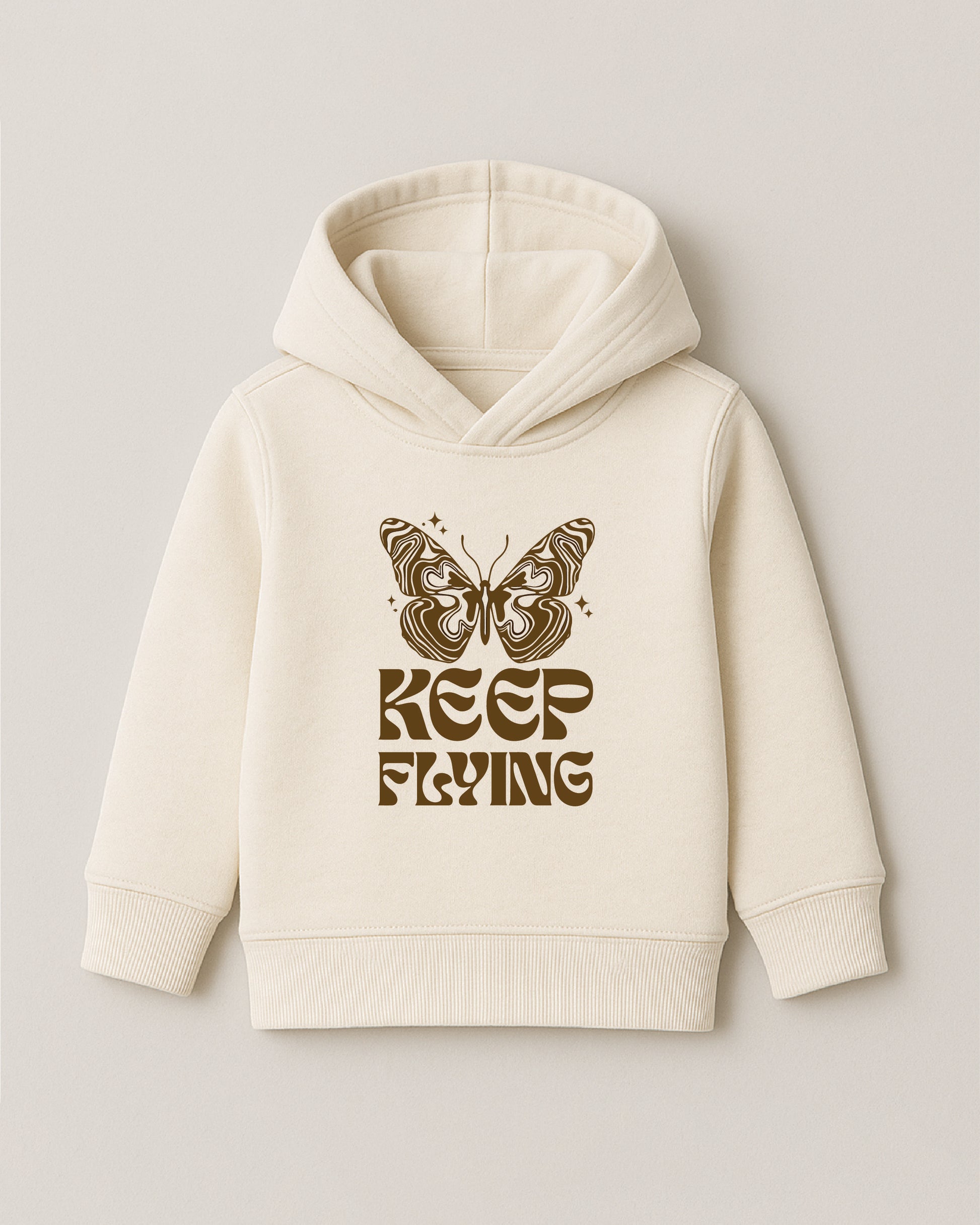Let your little dreamer soar with confidence in our Keep Flying hoodie. Made from ultra-soft fleece, this cozy beige hoodie combines comfort with a message of self-belief. The front features a beautifully detailed butterfly graphic paired with groovy retro typography symbolizing freedom, growth, and endless possibilities.
