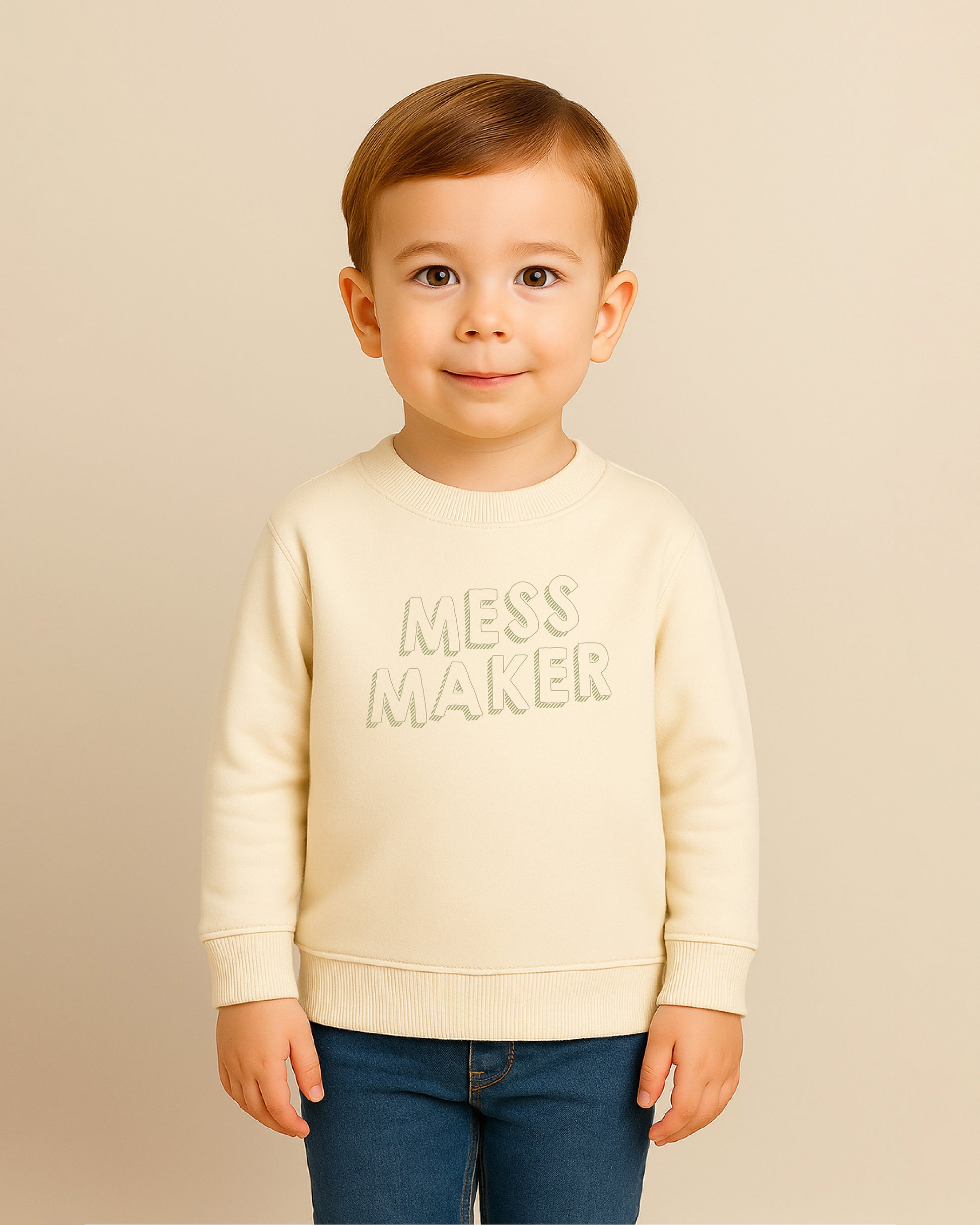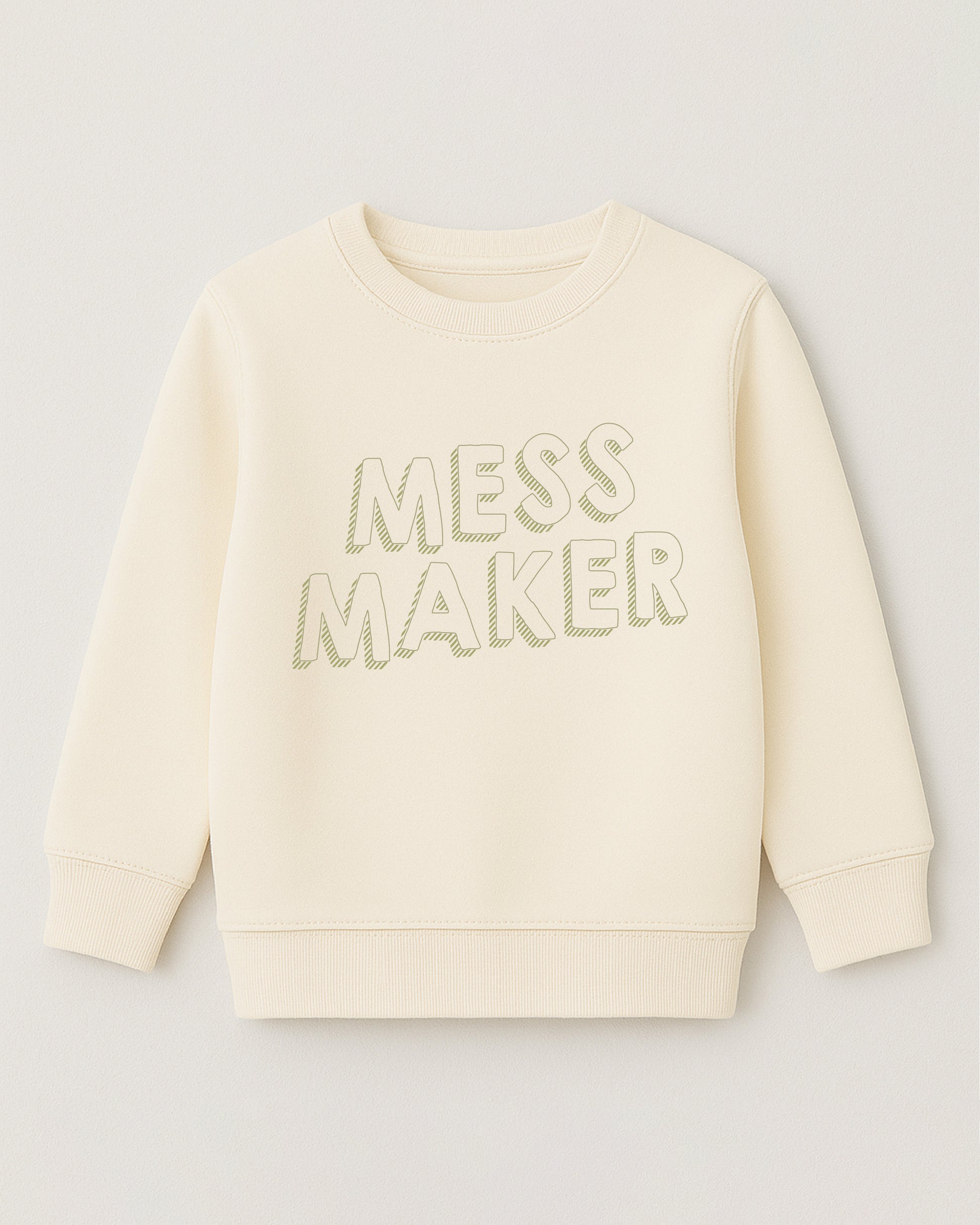 Crafted in a soft cream shade, this cozy sweatshirt features a playful 3D-style “MESS MAKER” text print in pastel green