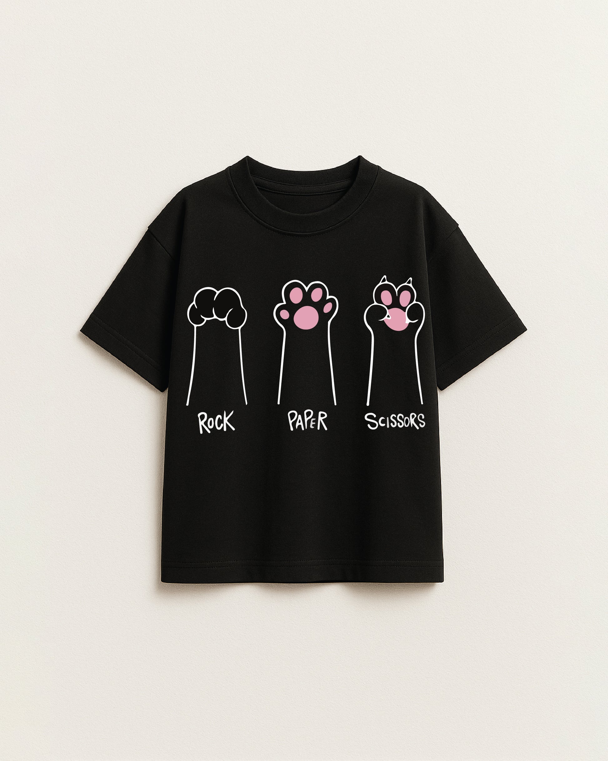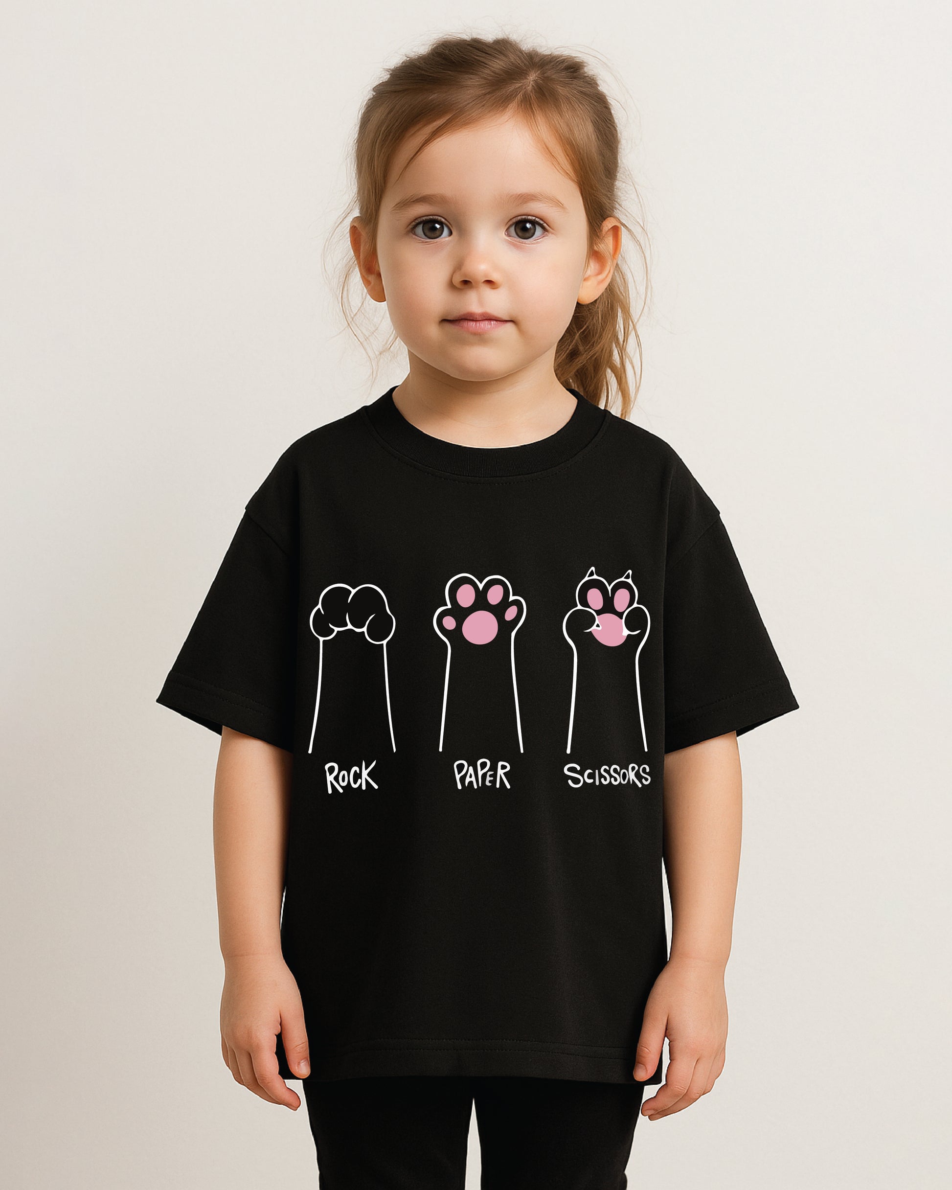 Add a playful twist to your little one’s wardrobe with our Rock, Paper, Scissors cat paw graphic tee. Made from soft, breathable cotton blend, this black t-shirt is both fun and comfy for everyday wear.