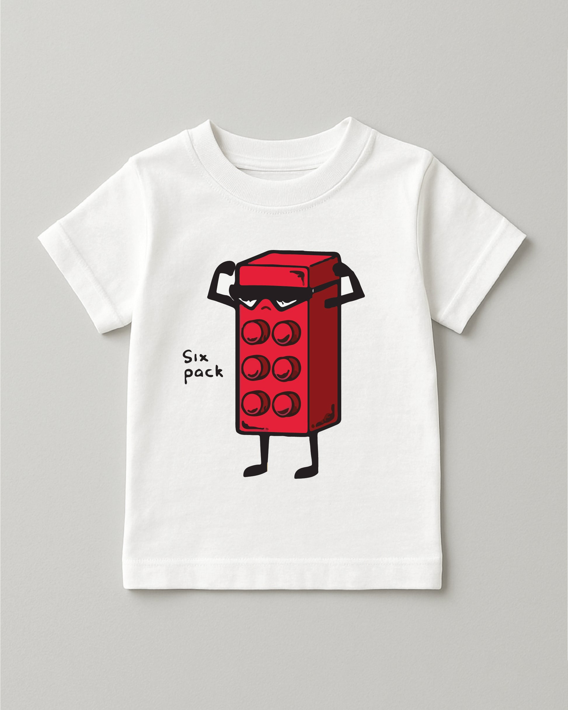 Playful, quirky, and packed with personality our Six Pack Tee is made for kids who love to stand out! Featuring a bold red cartoon block flexing its “six-pack” muscles , this graphic tee mixes humor with style.