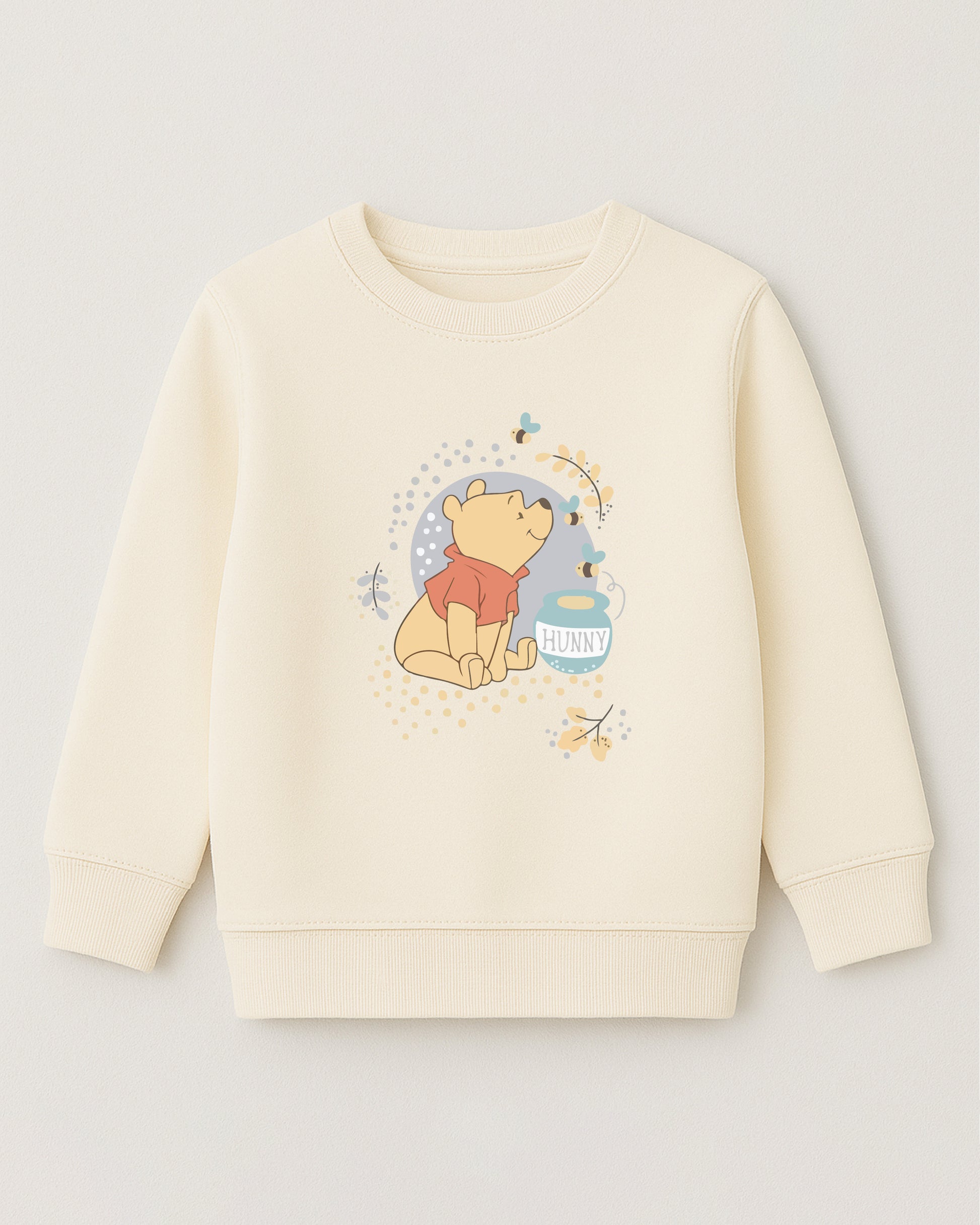 Wrap your little one in cozy comfort with our cream toned Winnie the Pooh Sweatshirt. Made from ultra-soft cotton fleece, this adorable piece features a heartwarming illustration of Pooh sitting beside his favorite “hunny” pot surrounded by buzzing bees.